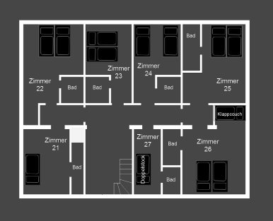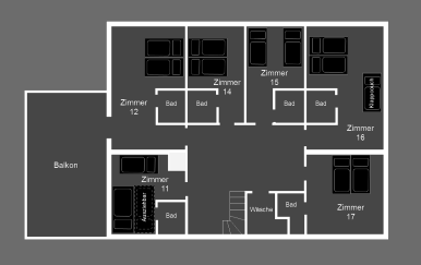 Im 2. Obergeschoss befinden sich 7 Zimmer. Wie auch in der Etage darunter sind diese jeweils mit eigenem Bad (Dusche und WC) ausgestattet und mit Echtholzmöbeln eingerichtet.