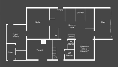 Im Erdgeschoss befinden sich die Gruppenräume. Neben dem großzügen Saal und der gemütlichen Bauernstube können Sie Ihre Kochkünste in der geräumigen Selbstversorgerküche unter Beweis stellen. Die kleineren Gäste finden im Spielzimmer bestimmt eine Beschäftigung. Weiterhin befinden sich Toiletten und ein Lagerraum im Erdgeschoß.